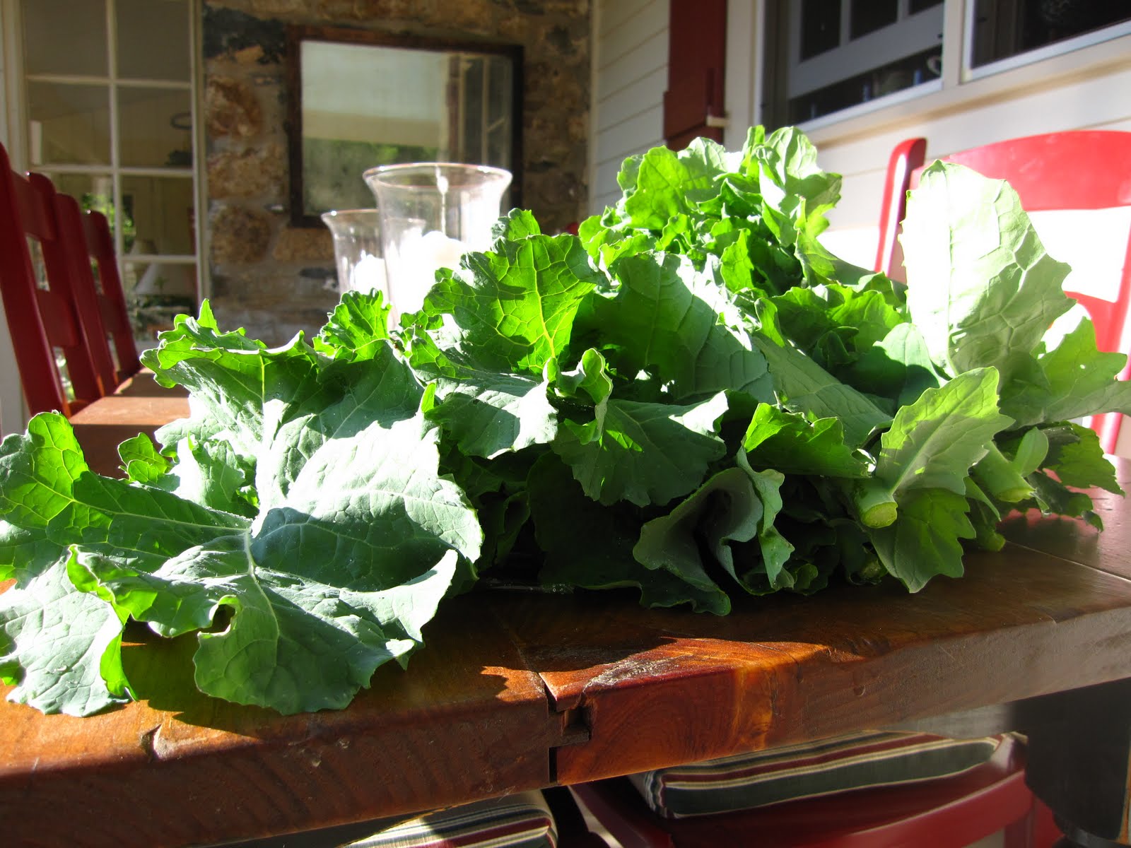 This is our first summer harvest of delicious, nutricious organic kale. FHFB asked me to cook something yummy out of it for an early Father's Day dinner on Friday evening, since we were busy with a graduation party on Saturday and Father's Day at my dad's house all day Sunday. I have it placed on our porch table before bringing it in for a good washing.